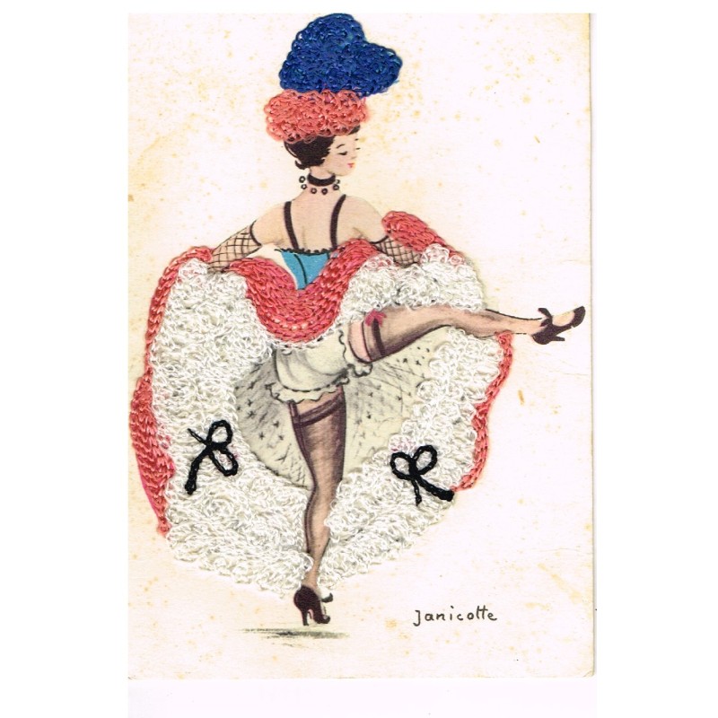 CARTE POSTALE BRODEE - DANSEUSE DE FRENCH-CANCAN - JANICOTTE
