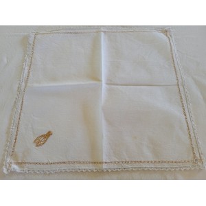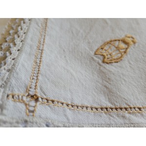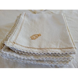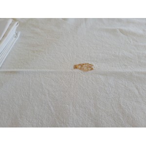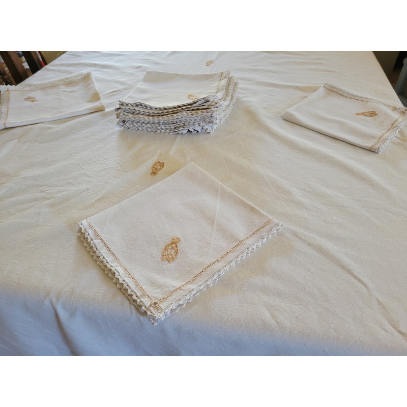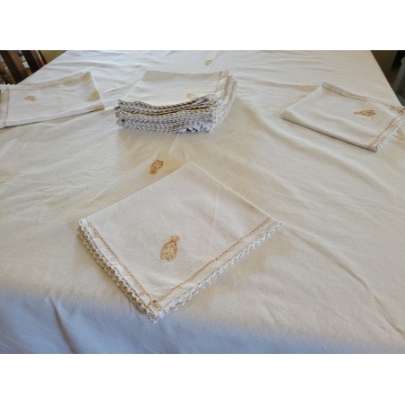 LINGE DE TABLE NAPPE ET DOUZE SERVIETTES EN LIN AVEC CIGALES BRODEES MAIN