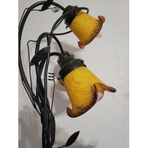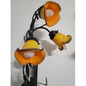 3 tulipes en pâte de verre flammée orange et jaune, bord granité gris.
